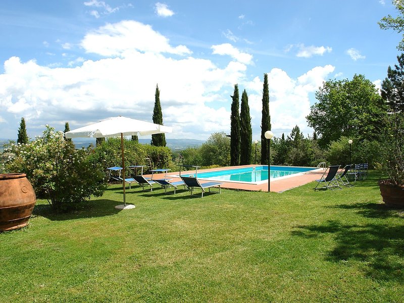 Esternamente la proprietà è circondata da un giardino ben tenuto e curato con una piscina di 12x5 mt, ampio parcheggio per 6 automobili e viste panoramiche meravigliose sulla campagna circostante e sulla città di San Gimignano.
